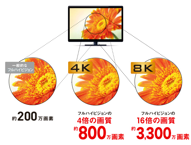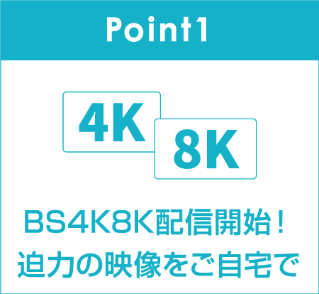 次世代の映像規格で現行ハイビジョンを超える超高画質の映像です。 4K8Kは従来のテレビ画質と比較し解像度が高いので、立体感が加わりキレイで臨場感のある映像が楽しめます。