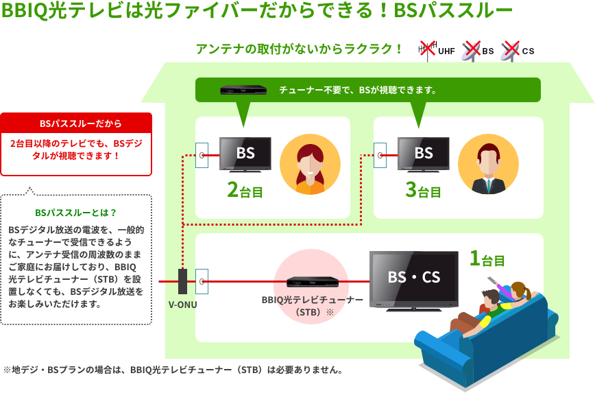BSパススルーをご利用いただくにはBBIQ 光テレビ「ベーシックプラン」「プレミアプラン」「地デジ・BSプラン」のご契約が必要です。